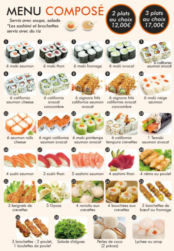 Servis avec soup, salade *Les sashimi et brochettes servis avec du riz